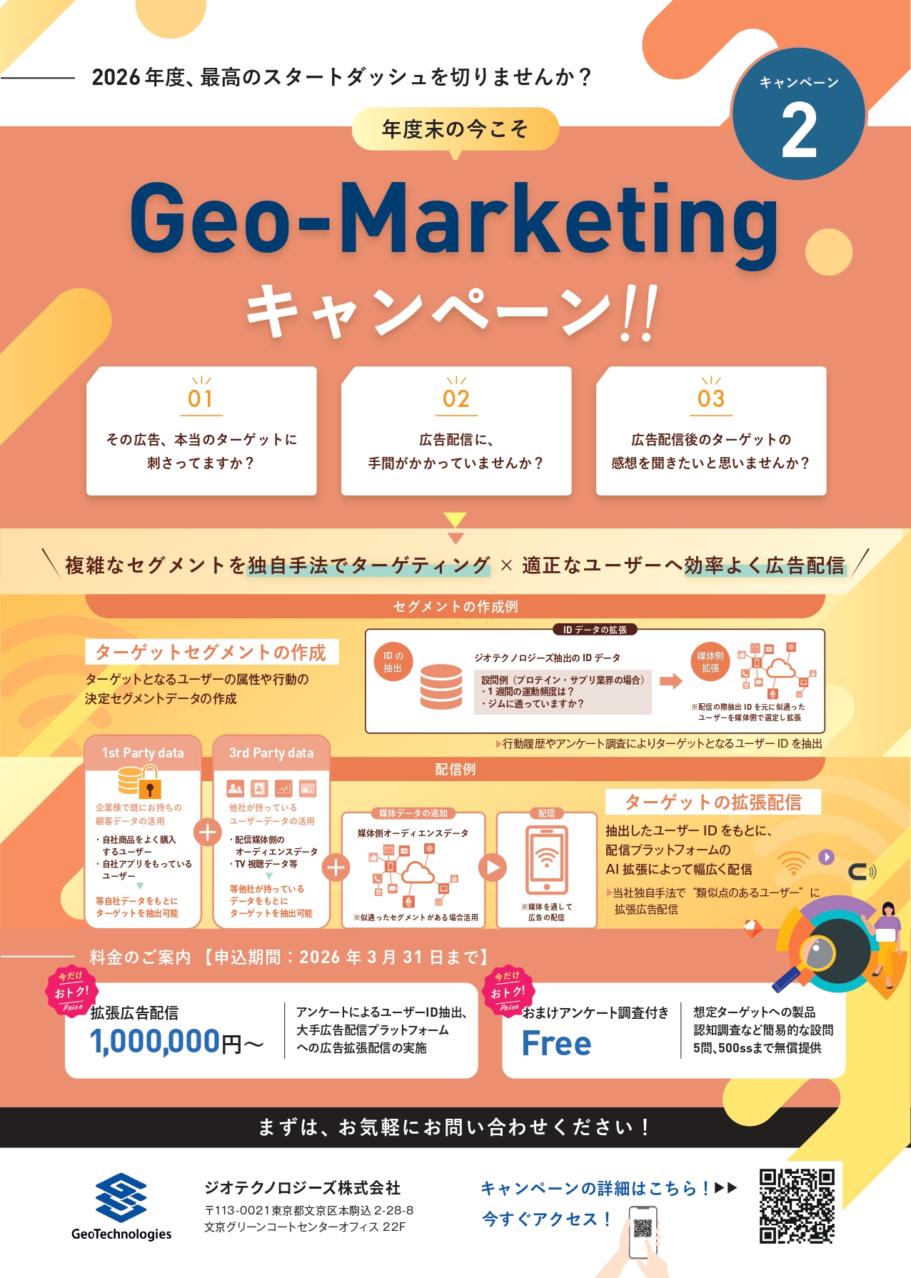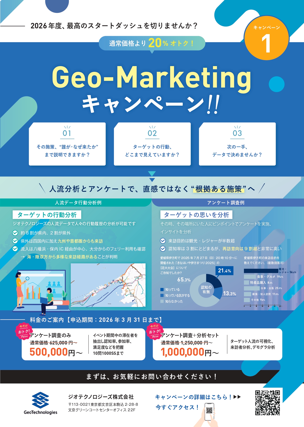 ジオテクノロジーズでは現在、2026年度に向けた集客強化を目指す自治体・企業の皆様を支援するため、人流データと位置情報広告を活用した特別パッケージ『Geo-Marketingキャンペーン』を実施しています。
