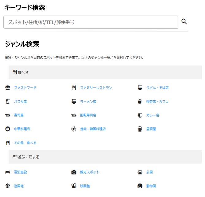 役所や公園、学校などの公共施設のほか、病院やレジャー施設、宿泊施設など、200種類に渡るジャンルの施設を網羅しています。
